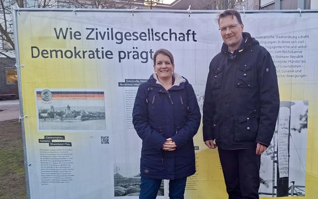 Bereits seit Montag, 20. Januar stehen vor dem GAK-Schulgebäude zwei Open-Air-Ausstellungen. Sie beschäftigen sich mit den Themen „Europa – Was bedeutet europäische Verantwortung für uns?” und „Zivilgesellschaft – Wie engagieren sich Menschen für Demokratie und Zusammenhalt?”. Die Ausstellungen laufen bis Freitag, 30. Januar und sind in den Unterricht eingebunden.